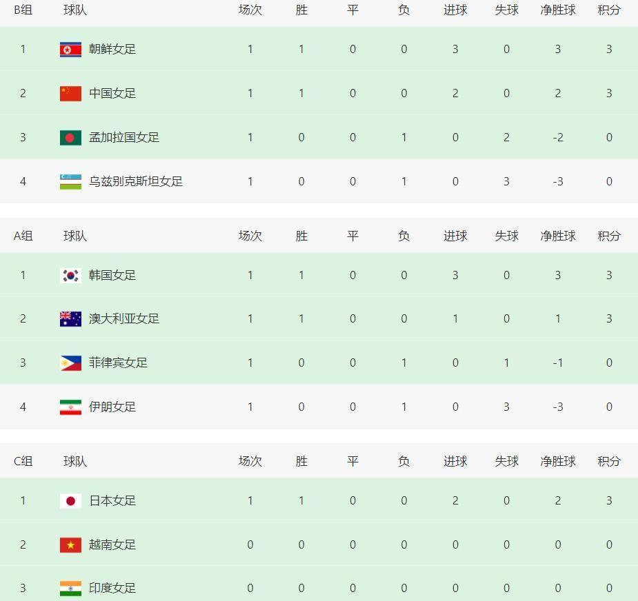 A组方面,韩国女足以3-0完胜越南女足,豪取3分、净胜球+3,强势领跑积分榜;